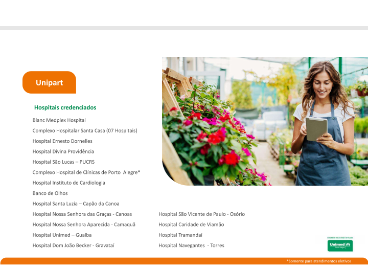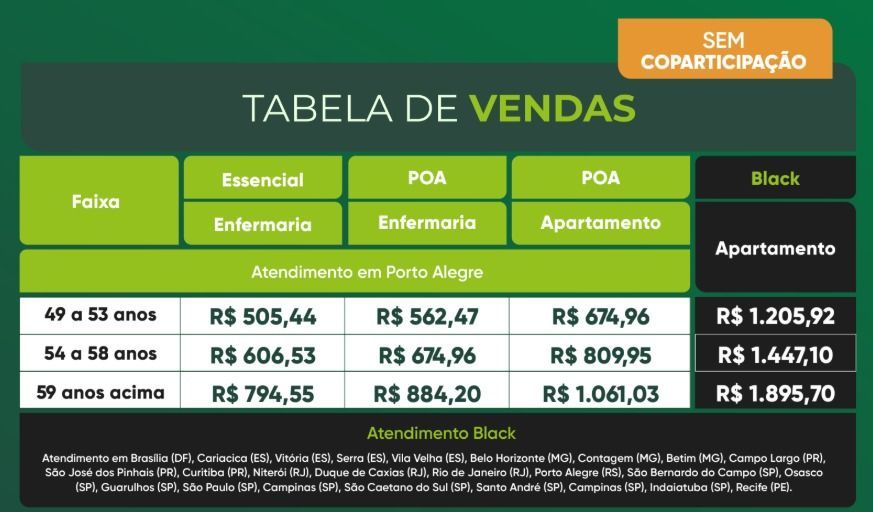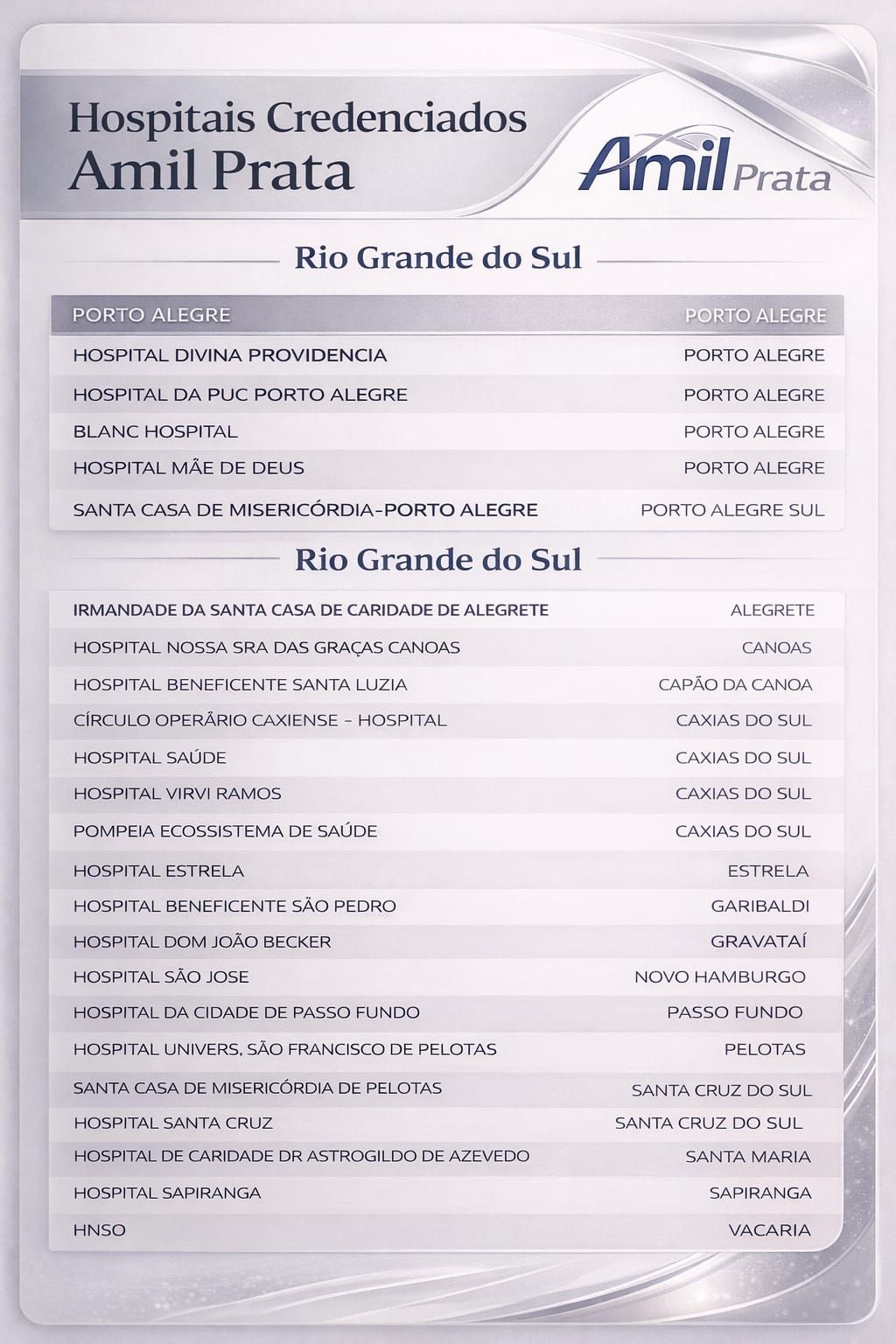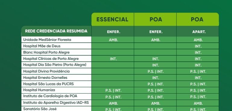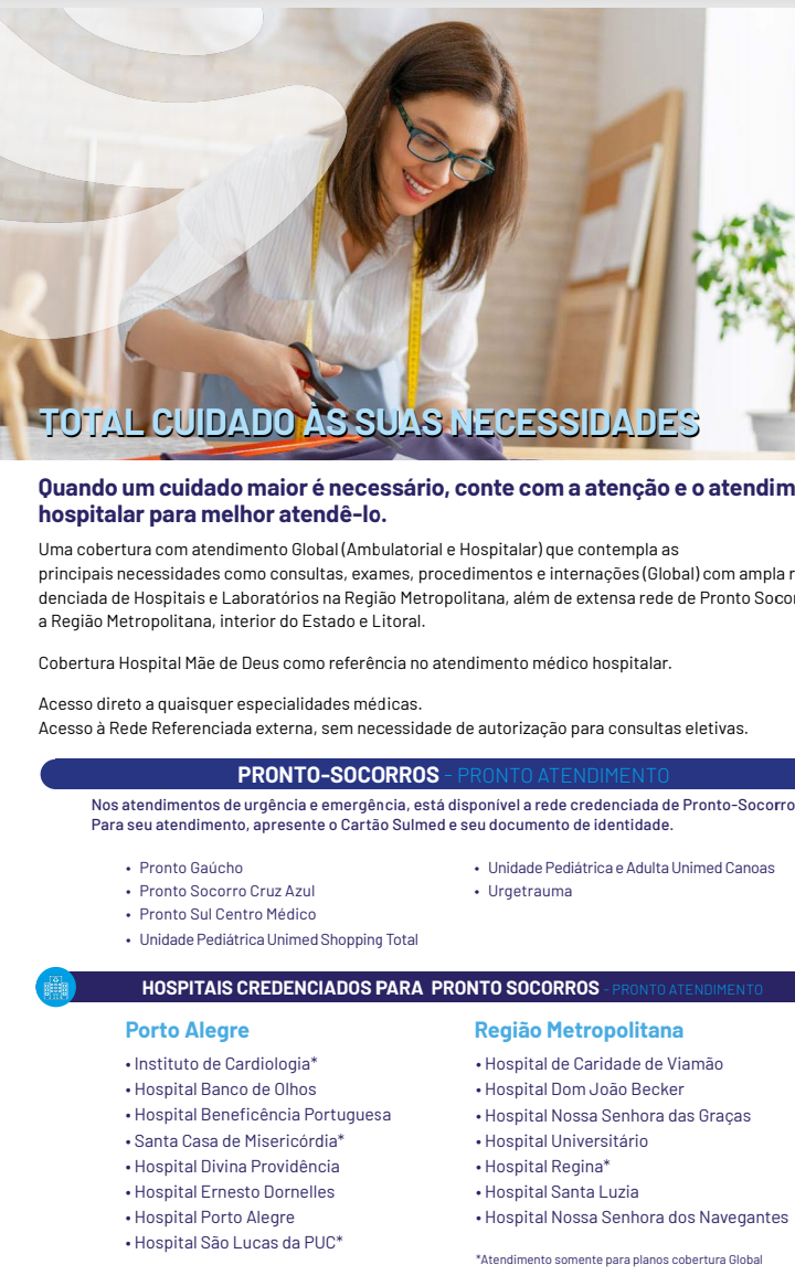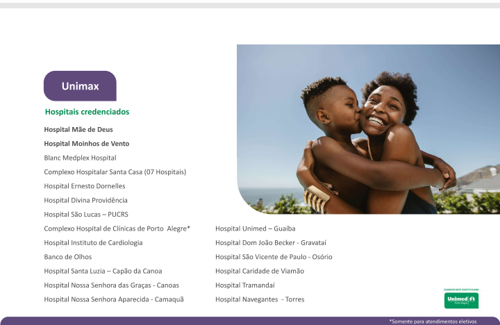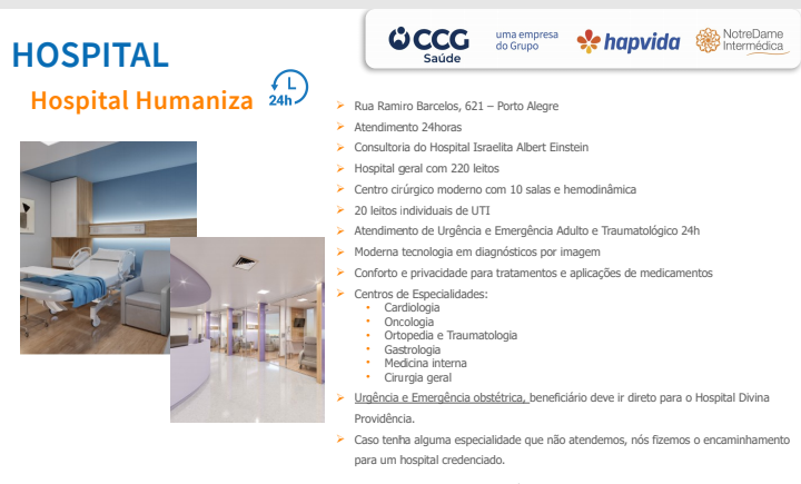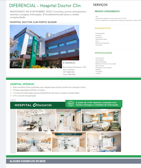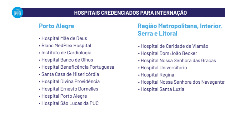 Principais Hospitais em Porto Alegre: Moinhos de Vento, Mãe de Deus,Complexo Santa Casa, Banco de Olhos, Puc, Divina Providencia e Ernesto Dorneles, Inclui Laboratório Weinmann entre outros, sem limites de Utilização. Rede credenciada para pronto atendimento, ex: Traumato Moinhos, Pronto Kids, Moinhos de Vento, Santa Casa. Aproveitamento de carências de planos de saúde congeneres.